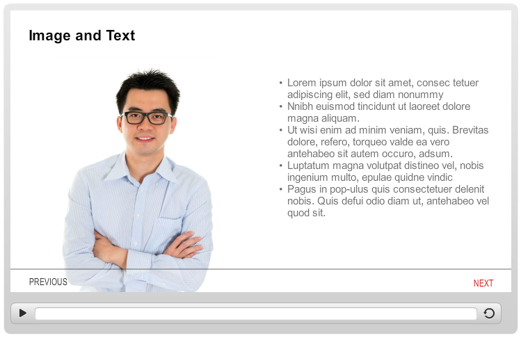 Level one e-Learning example demonstrating navigation, page formatting, and interactions. Try it live .